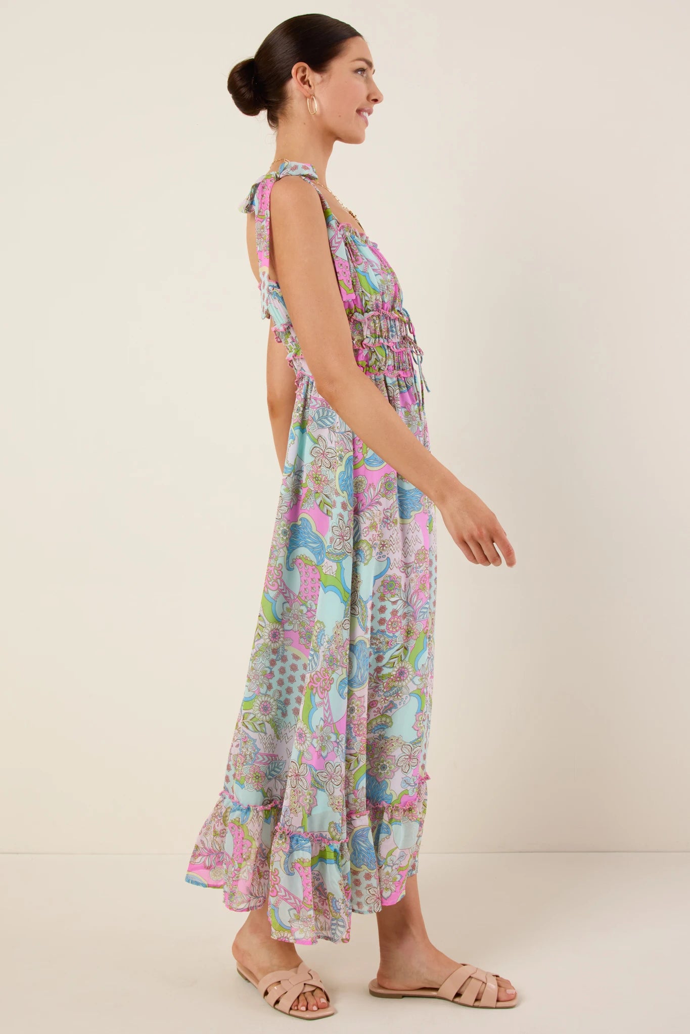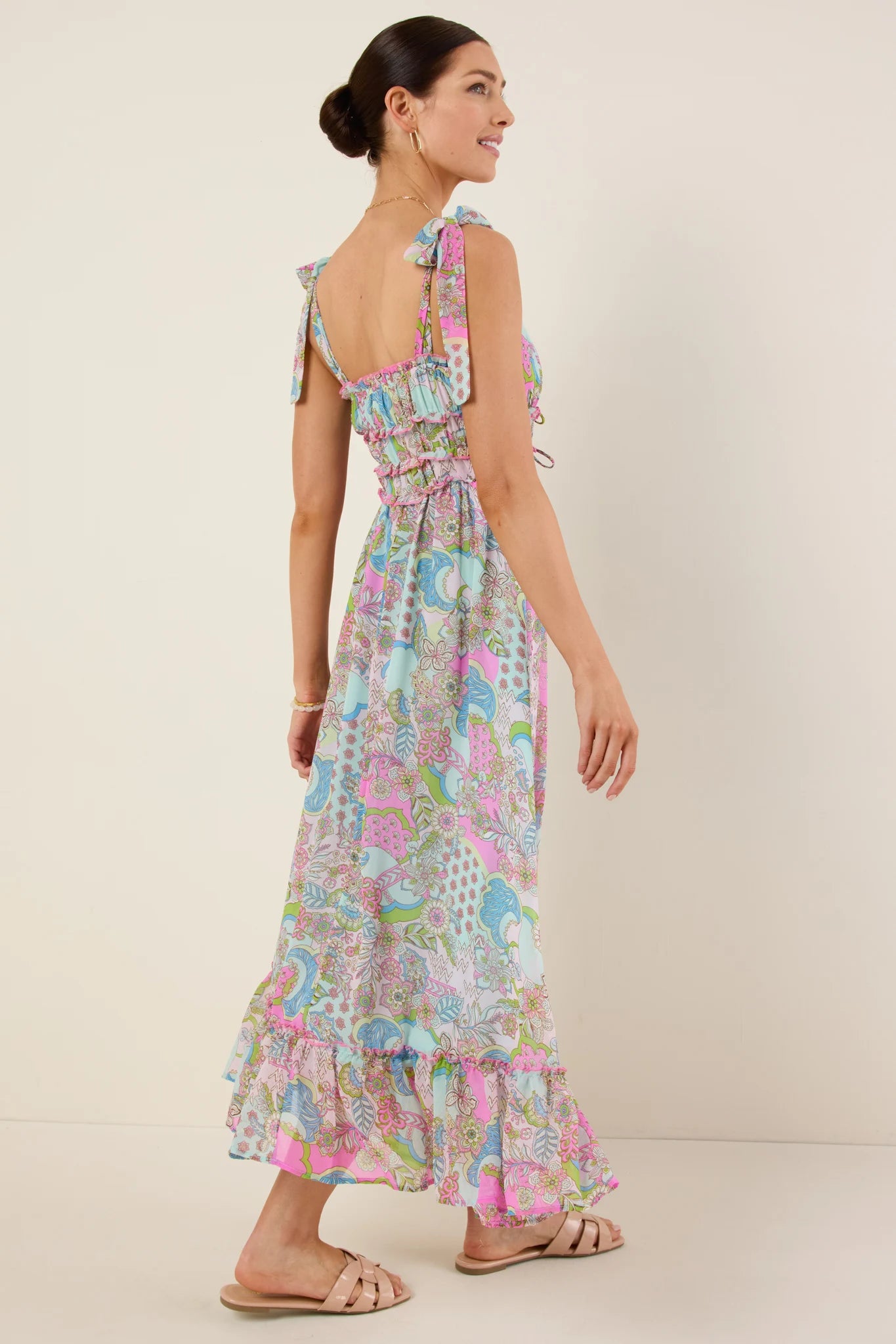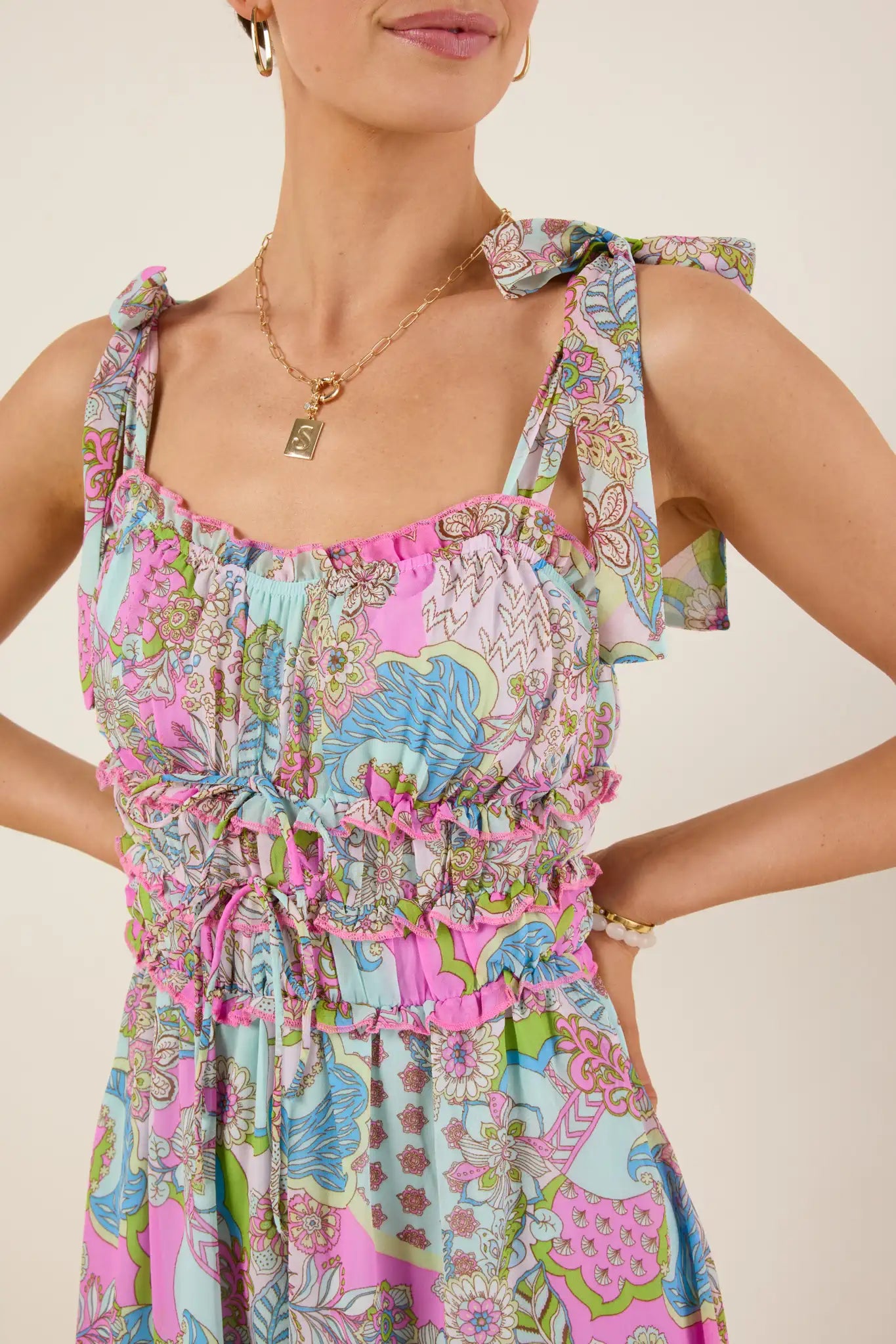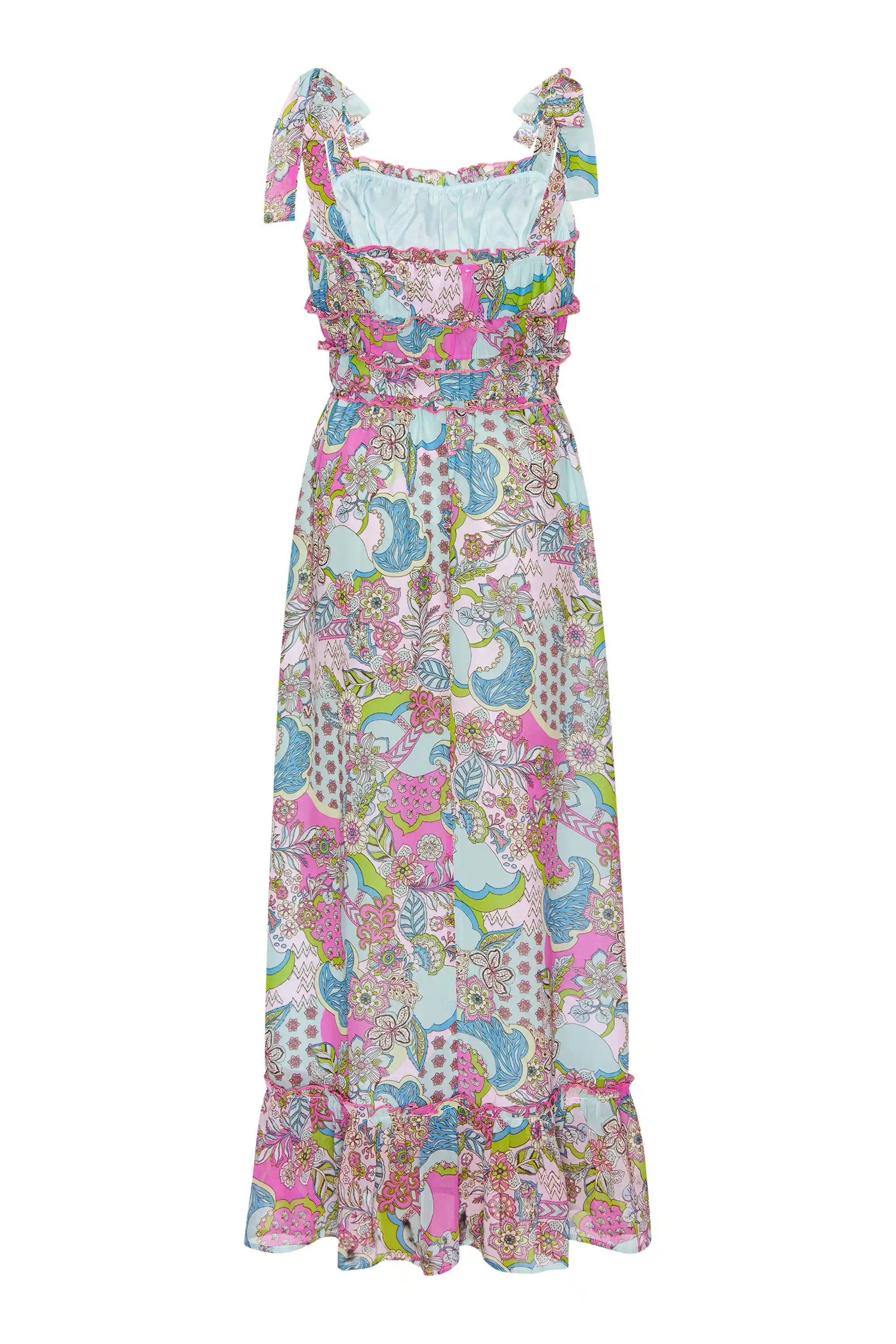 - Smocked bodice; self-tie drawstrings